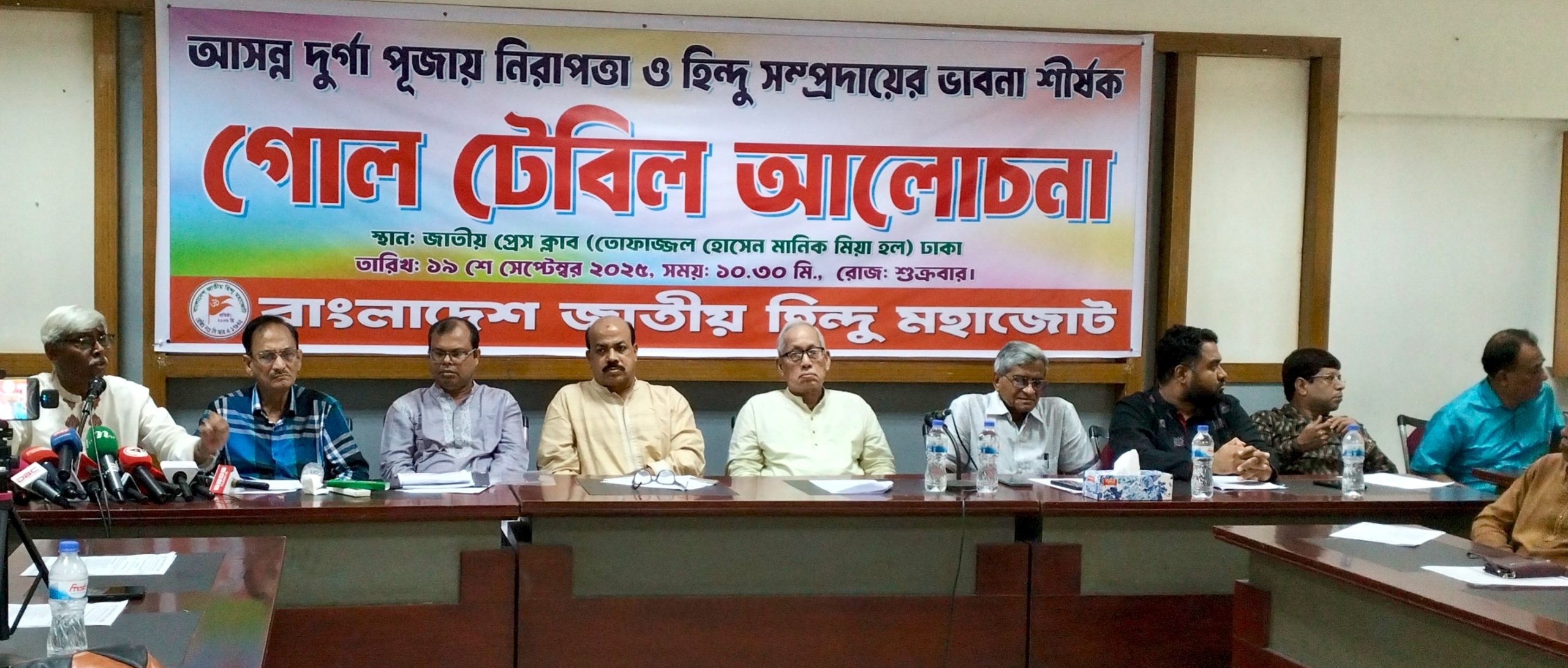 অভিজিৎ ব্যানার্জি, ঢাকা: বাংলাদেশ জাতীয় হিন্দু মহাজোট এর আয়োজনে আসন্ন দূর্গা পুজায় নিরাপত্তা ও হিন্দু সম্প্রদায়ের ভাবনা শীর্ষক গোল টেবিল আলোচনা অনুষ্ঠিত হয়। আজ ১৯ শে সেপ্টেম্বর ২০২৫ ইং সকালে জাতীয় প্রেস ক্লাব, ঢাকায় (তোফাজ্জল হোসেন মানিক মিয়া) হলে লিখিত বক্তব্য পাঠ করেন পলাশ কান্তি দে, নির্বাহী মহাসচিব ও মুখপাত্র বাংলাদেশ জাতীয় হিন্দু মহাজোট। আজকের আলোচনা সভার সভাপতিত্ব করছেন ড. প্রভাস চন্দ্র রায়, সভাপতি-বাংলাদেশ জাতীয় হিন্দু মহাজোট।