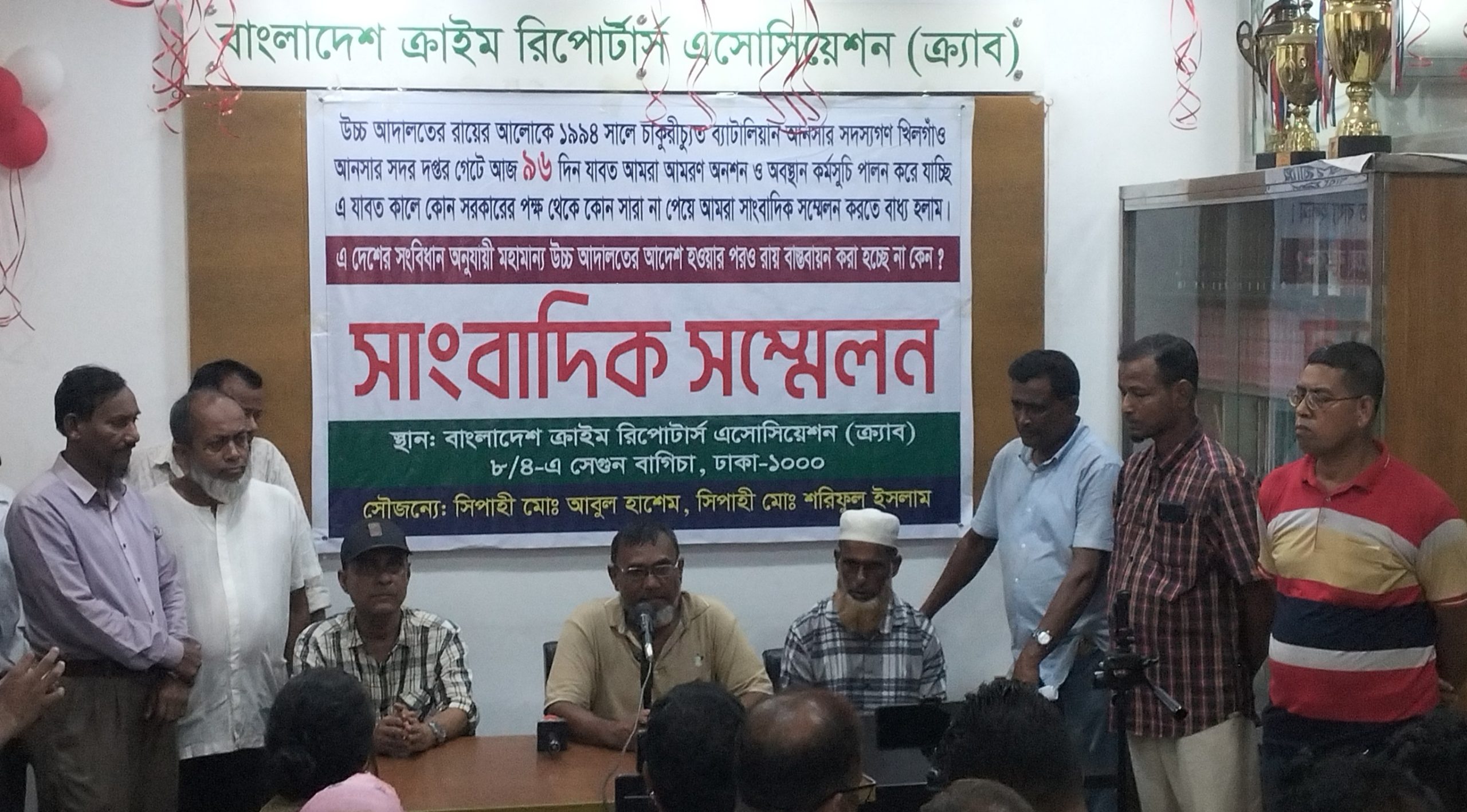 খাইরুল ইসলাম, ঢাকা: উচ্চ আদালতের রায়ের প্রেক্ষিতে ১৯৯৪ সালের চাকুরীচ্যুত আনসার ব্যাটালিয়ন সদস্যদের খিলগাঁও সদর দপ্তর গেইটে অনশন ও অবস্থান কর্মসূচি পালন করছে গত ৯৬ দিন ধরে। মহামান্য উচ্চ আদালতের রায়ের পরও রায় বাস্তবায়ন না হওয়ার কারণে আজ ২৯/৯/ ২০২৫ইং রাজধানী ঢাকার রিপোর্টার্স ইউনিটির বাংলাদেশ ক্রাইম রিপোর্টার্স অ্যাসোসিয়েশনে এক সংবাদ সম্মেলনের আয়োজন করে ভুক্তভোগী আনসার সদস্যরা।