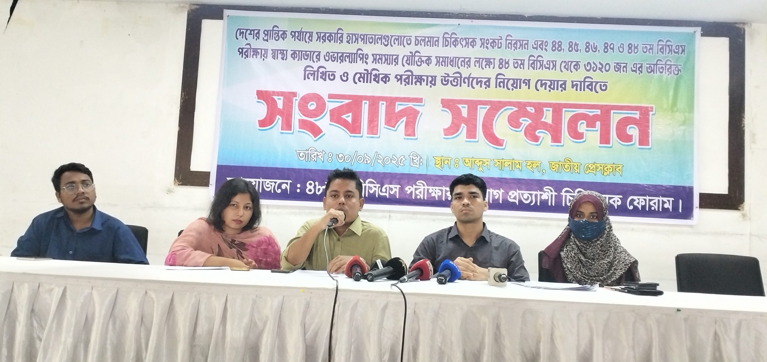 তৃণমূল জনগোষ্ঠীর সরকারি স্বাস্থ্যসেবা নিশ্চিত করার লক্ষ্যে আজ ৩০/০৯/২০২৫ইং সকালে রাজধানী ঢাকার জাতীয় প্রেসক্লাবের তৃতীয় তলায় আব্দুস সালাম হলে এক সংবাদ সম্মেলনের আয়োজন করেন ৪৮তম বিসিএস নিয়োগপ্রত্যাশী সাধারণ চিকিৎসক ফোরাম। ৪৮তম (বিশেষ) বিসিএস-এ নিয়োগ প্রত্যাশী সাধারণ চিকিৎসকবৃন্দের পক্ষে লিখিত বক্তব্য পাঠ করেন, ডা: সাদমান সাকিব রাফি, ডা: আল মুনতাসির এবং ডা: সেজানা খান।