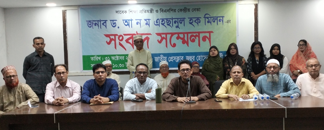 মো: সাইফুল আলম সরকার, ঢাকা: ড. আ ন ম এহছানুল হক মিলন, সাবেক শিক্ষাপ্রতিমন্ত্রী ও বাংলাদেশ জাতীয়তাবাদী দল বিএনপি’র জাতীয় নির্বাহী কমিটির সদস্য। বিএনপি’র সংগঠনিক কাজে ঢাকা আসার পর গত ৩০ অক্টোবর ২০২৫ তারিখে ব্যাংককে চিকিৎসার উদ্দেশ্যে যাত্রাকালীন সময়ে ঢাকা আন্তর্জাতিক বিমানবন্দরে জানতে পারেন তার বিদেশ গমনে নিষেধাজ্ঞা জারি করা হয়েছে। হঠাৎ করে এই নিষেধাজ্ঞা জেনে তিনি স্তম্ভিত হয়ে যান। তাই আজ ৩১ অক্টোবর ২০২৫ইং রাজধানী ঢাকার জাতীয় প্রেসক্লাবের দ্বিতীয় তলায় জহুর হোসেন চৌধুরী হলে এক সংবাদ সম্মেলন আয়োজন করেন।
