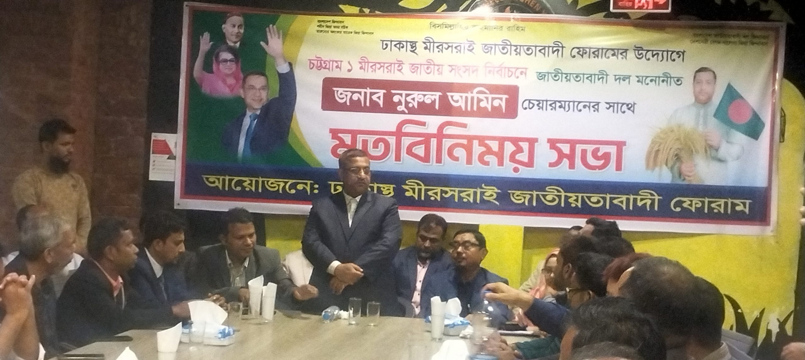 অভিজিৎ ব্যানার্জি, ঢাকা: ঢাকাস্থ মীরসরাই জাতীয়তাবাদী ফোরামের উদ্যোগে বাংলাদেশ জাতীয়তাবাদী দল (বিএনপি) মনোনীত চট্টগ্রাম -১ মীরসরাই আসনের প্রার্থী জনাব নুরুল আমিন চেয়ারম্যান সাহেবের সাথে “নির্বাচন সংক্রান্ত মতবিনিময় সভা” মতিঝিলস্থ কিচেন ইয়ার্ডে (V. I. P কক্ষ) গতকাল ১৯/১২/২০২৫ ইং তারিখ সন্ধ্যা ৬ ঘটিকায় অনুষ্ঠিত হয়। এতে ফোরামের সভাপতি জনাব মো: আইয়ুব খান এর সভাপতিত্বে সাধারণ সম্পাদক মো: মুজাহিদুল ইসলামের সঞ্চালনায় প্রধান অতিথি হিসেবে বক্তব্য রাখেন বাংলাদেশ জাতীয়তাবাদী দল (বিএনপি) মনোনিত চট্টগ্রাম -১ মীরসরাই আসনের প্রার্থী জননেতা জনাব নুরুল আমিন চেয়ারম্যান সাহেব।